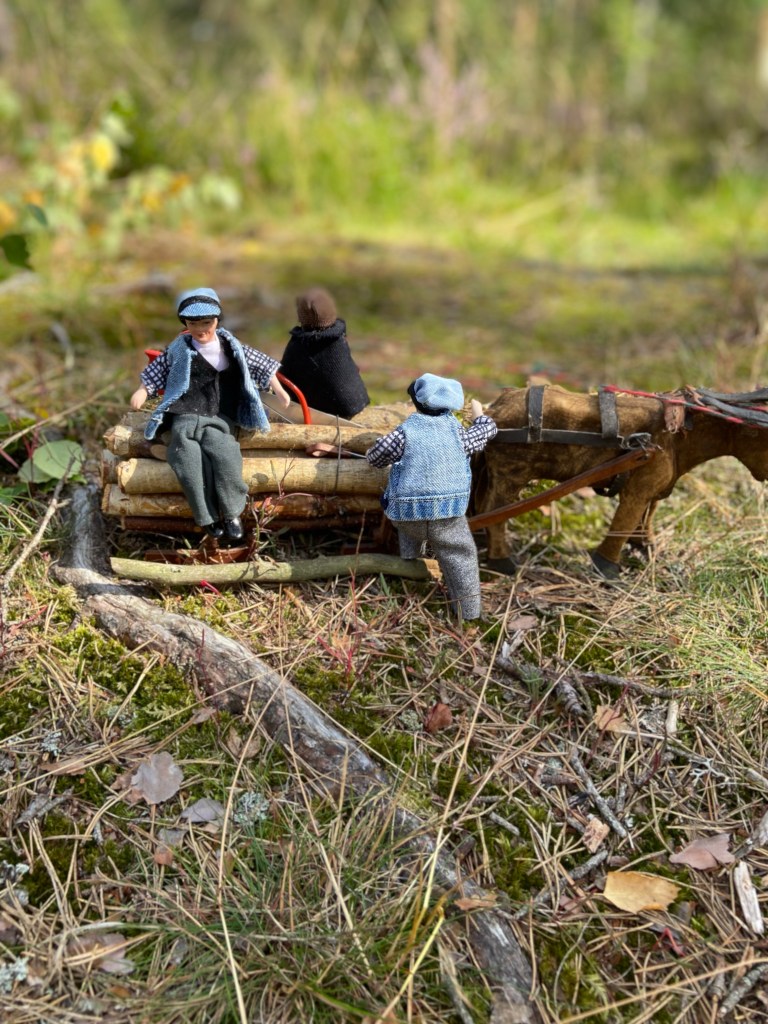 Idag var det dags att börja såga ner träd till husbygget. Så sagt och gjort. Det anlitades en körsnär som heter Hugo men hans häst Brunte var sjuk så den som skulle dra timmerlasset blev en kossa som heter Maj-Ros. Byggarna Oscar och Carl gav sig ut i skogen tillsammans med Hugo och Maj-Ros för att börja såga ner träd. Det första trädet blev för stort det insåg de snabbt. Det andra som de hittade var alldeles för litet, men sen fann de fina björkar som skulle passa perfekt.