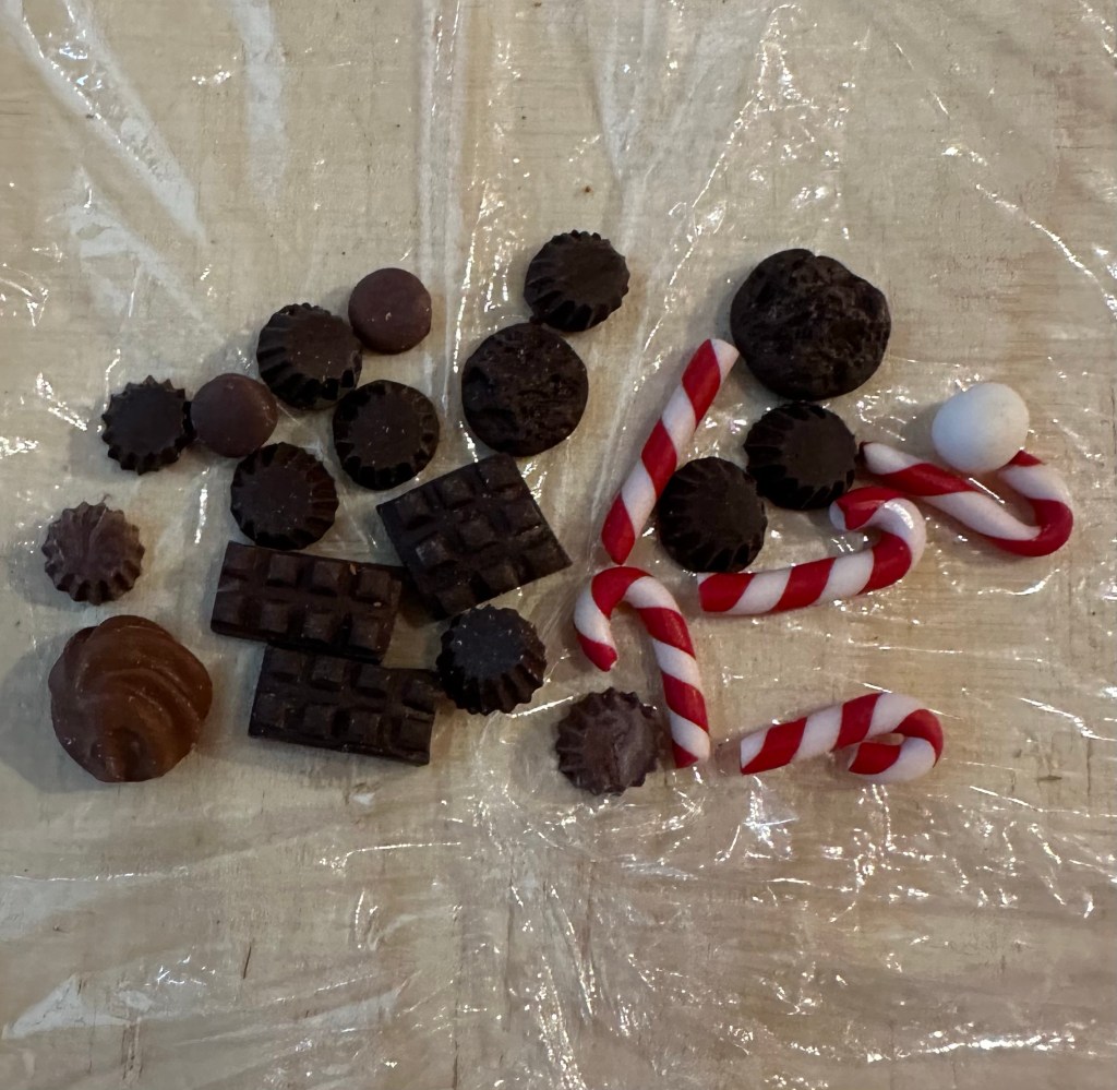 Idag kom lite saker på posten. Mycket är till dockskåpet. Men en del är tänkt att få vara i mitt tomteland. Det är polkagriskäppar, lussekatter choklad, backar och två fina kransar till tomtarna. En bänk och ett skåp och en massa ätbart som är till dockhuset. Allt är tillverkat av en tjej som heter Malin. Har handlat av henne tidigare och hon är en mycket duktig minityarist.