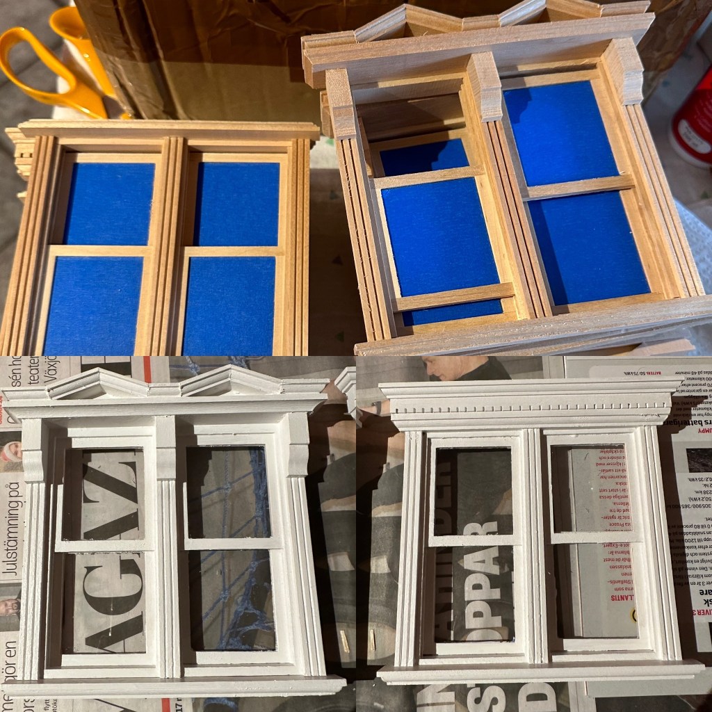 Vilket jobb han gjort. Alla fönster på dörrar och fönster fick han täcka in innan han målade. Det tog tid. Det är 12 fönster bara till själva huset. Vilket pilligt jobb. Sen målade han varje fönster och lister två ggr. Pubens dörr målade han svart och slipade lite på så den inte ska se nymålad ut. Tror detta kommer att bli jättebra. Han har även spikat ihop takkupor och satt på knutar och gjort iordning fönster till dessa. Det är fem stycken. Sen ska detta också målas.