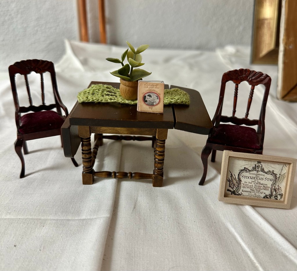 Idag kom det fina slagbordet och lite annat. Har en liten rolig historia att berätta om slagbordet. När vi körde hem från Kosta förra veckan vände jag mig mot Maths och säger, jag har köpt ett fint slagbord till köket. Va säger Maths och ser mycket märklig ut i ansiktet. Jag tar upp mobilen och visar bilden. Det ser tungt ut och vilka tjocka skivor säger han. Jamen kolla så fina svarvade ben bordet har säger jag. Jo men tungt och bära säger han och ser väldigt konstig ut i ansiktet. Va säger jag. Jag tycker om våra köksmöbler säger han då. Aha då förstod jag. Hans konstiga uppsyn var ju för han trodde jag hade köpt ett nytt bord till vårt kök inte dockhuset😂😂 Tänk vad man kan missförstå varandra men roligt var det😂
