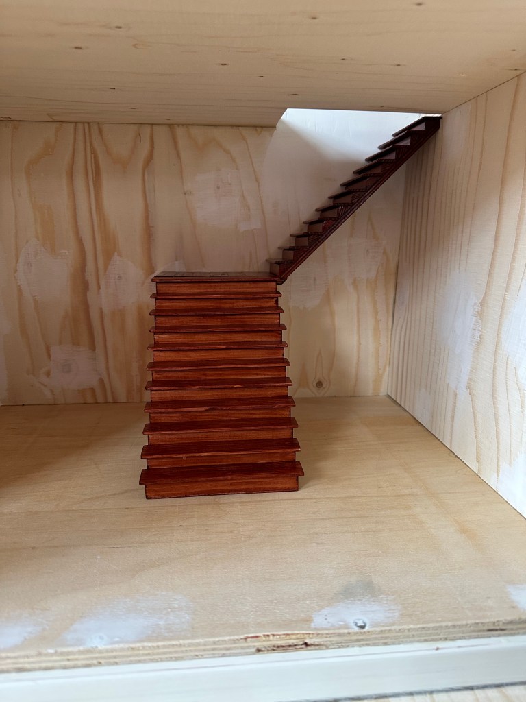 Tror denna pub kommer att bli häftig. Nu har han tillverkat en hylla som har samma form som disken men ska hänga över. Lister har tillverkats. Han har blött ner virket som han sedan format och satt i press. Varje dag ser man något hända. Färgen blir mahogny. Trappan är också målad i fin mahogny. Vi ska ha matta i den stora trappan, men trappan är längre än trappmattor som finns att köpa. Då fick jag ett förslag från en miniatyrist som sa att man kan ju köpa mindre mattor och sedan sy ihop dem till trappan. Det låter som ett bra förslag tycker jag. Så nu letar jag mattor som ska passa in och som jag sedan kan sy ihop. Nu återstår lite trappräcken också sedan är trappan klar. Här kommer lite bilder på trappor och puben.
