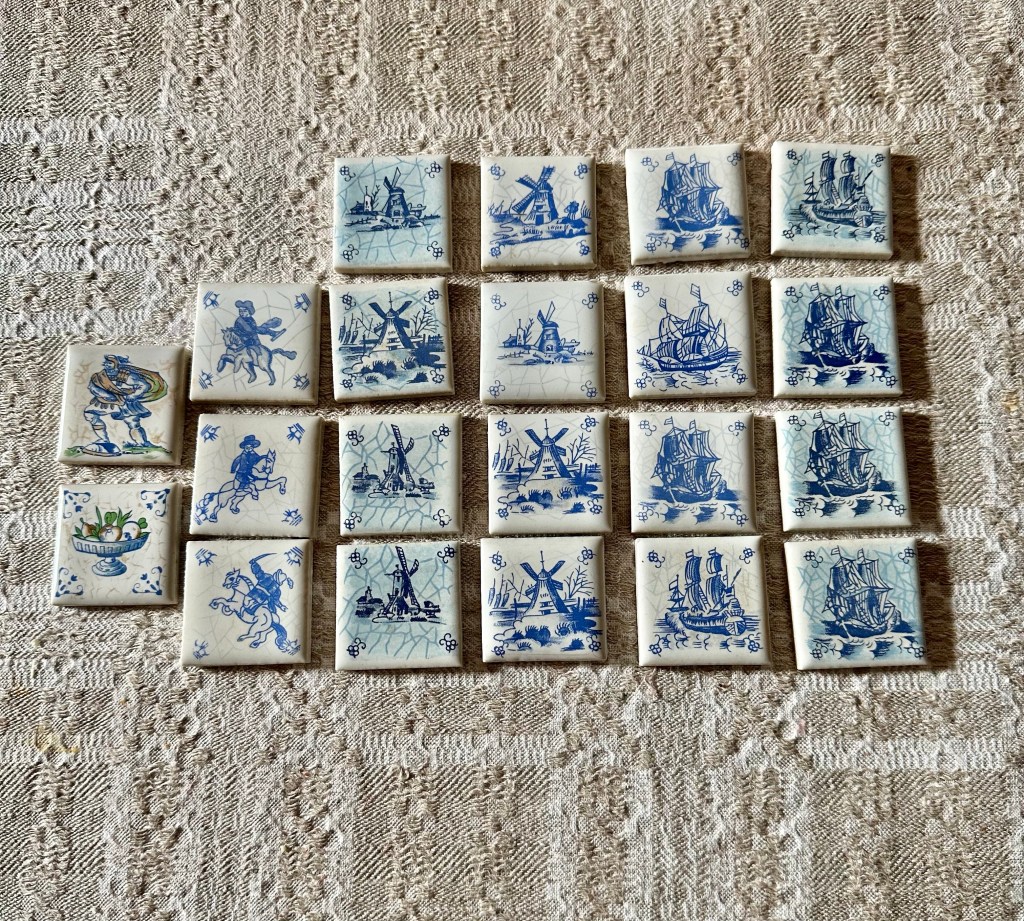 Denna vecka har det kommit lite små tavlor som ska hänga på väggen ovanför trappan som går upp till vinden. Det har kommit små miniatyrtavlor målade på porslin av företaget Limoges i Frankrike. Så fina. Det har även kommit fler flaskor till puben och där går det ju åt en hel del. Har även köpt fina små kakelplattor av en säljare. Som vi kanske kan ha i köket. 10 plattor med ekfaner har också kommit och vi väntar på en tunna med kran till puben.