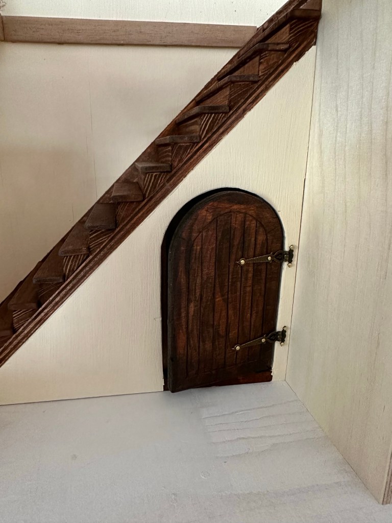 Nu är trappan till vinden på plats. Maths har även tillverkat en mycket fin dörr till det lilla badrummet som ligger under trappan. Där kommer man kunna se en skymt av ett badkar. Badkaret som står där har vi tänkt använda. Men man vet aldrig kanske jag hittar en fin gammal toastol som passar bättre. Ja vi får se. Rätt som det är så hittar man något eller får en ny idé.