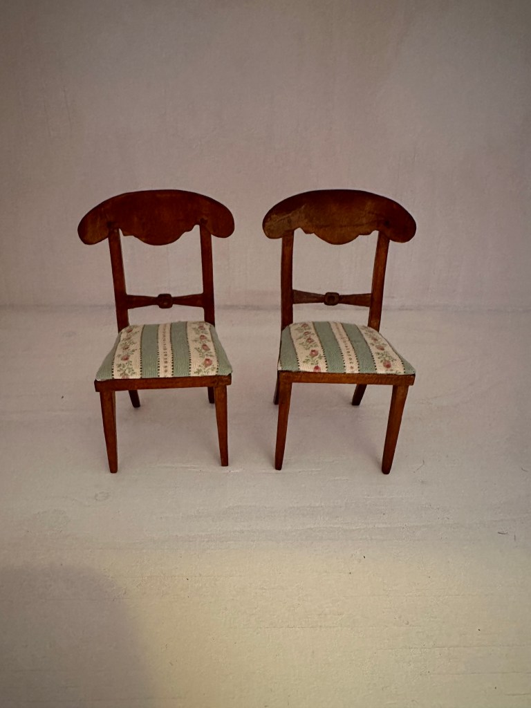 Nu har det kommit fina möbler, ett par stolar i empirstil som är tillverkade av F W Gerlach, ett tyskt företag som tillverkade dockskåpsmöbler mellan 1850-1930. I samma rop fick jag fler fina möbler. Det var ett halvmånebord, en fin buffé, en vacker spegelbyrå som ska stå i entrén, två äldre rokokostolar i metall. Det har även kommit fina gardiner och lampor.