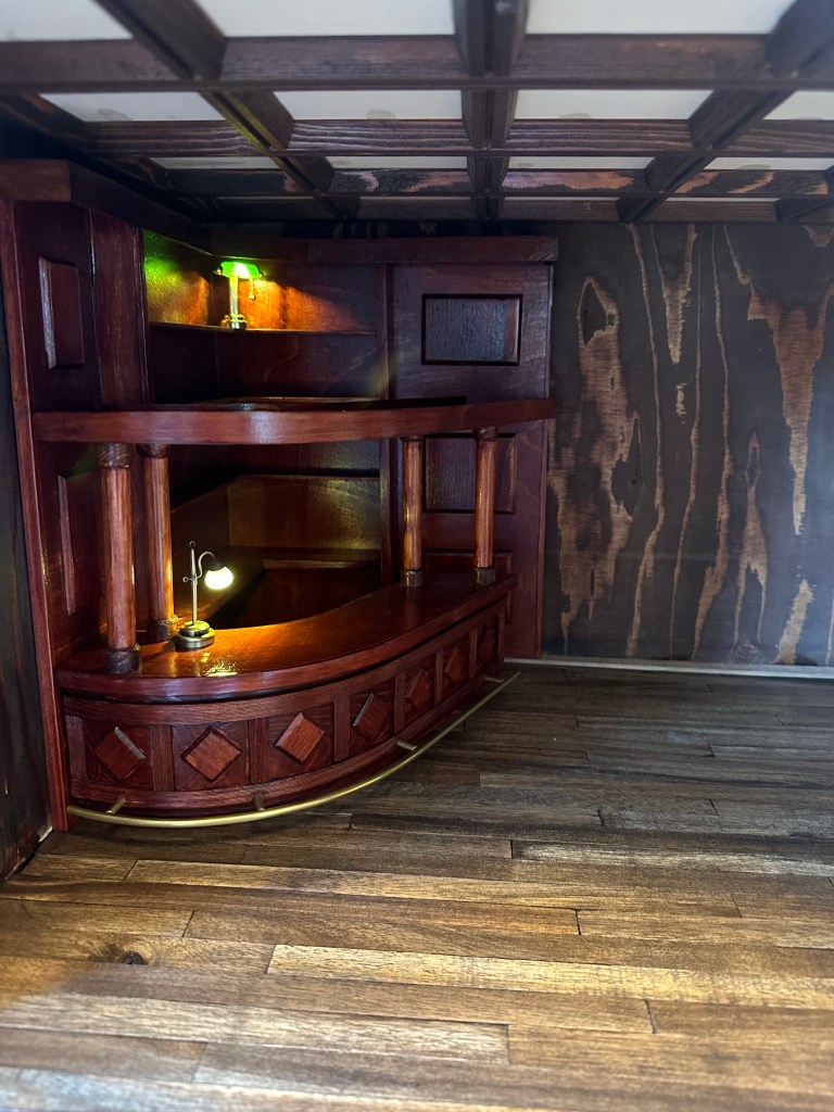 Så här fint, men ändå långt kvar, blir det i puben. Visar lite hur det kan bli. Dessa lampor ska ju inte vara i puben sen. Det blir andra men tycker att det syns bättre med lite ljus.