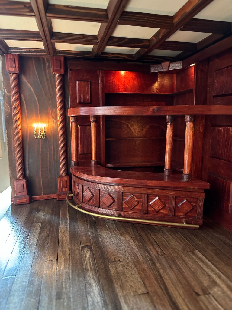 Maths har fått upp både vägglampor och lampa i den öppna spisen. Han har även satt belysning i vägghyllan bakom bardisken. Det blir så fint där inne i puben med belysningen. Tänk vad lite lampor kan göra.
