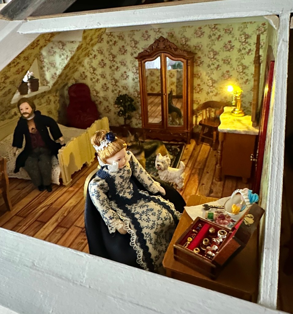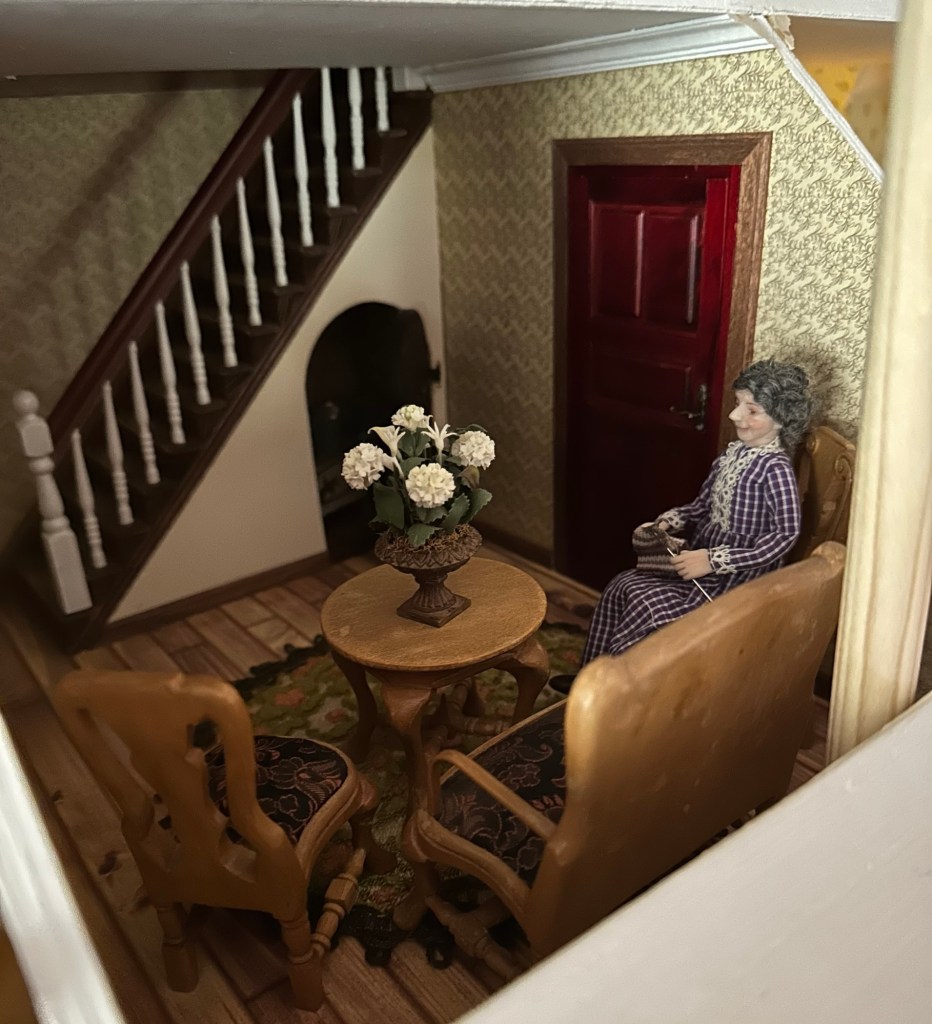 Köpte en ny docka av Anne Collin. Den är så fin. Det är en dam som sitter och stickar. Dockans namn kommer att vara Astrid. Det namnet kändes rätt och passade henne mycket bra tycker jag. Här kommer en bild på henne. Visst är hon fin. Hon sitter och stickar i hallen mellan sovrum och barnkammaren.