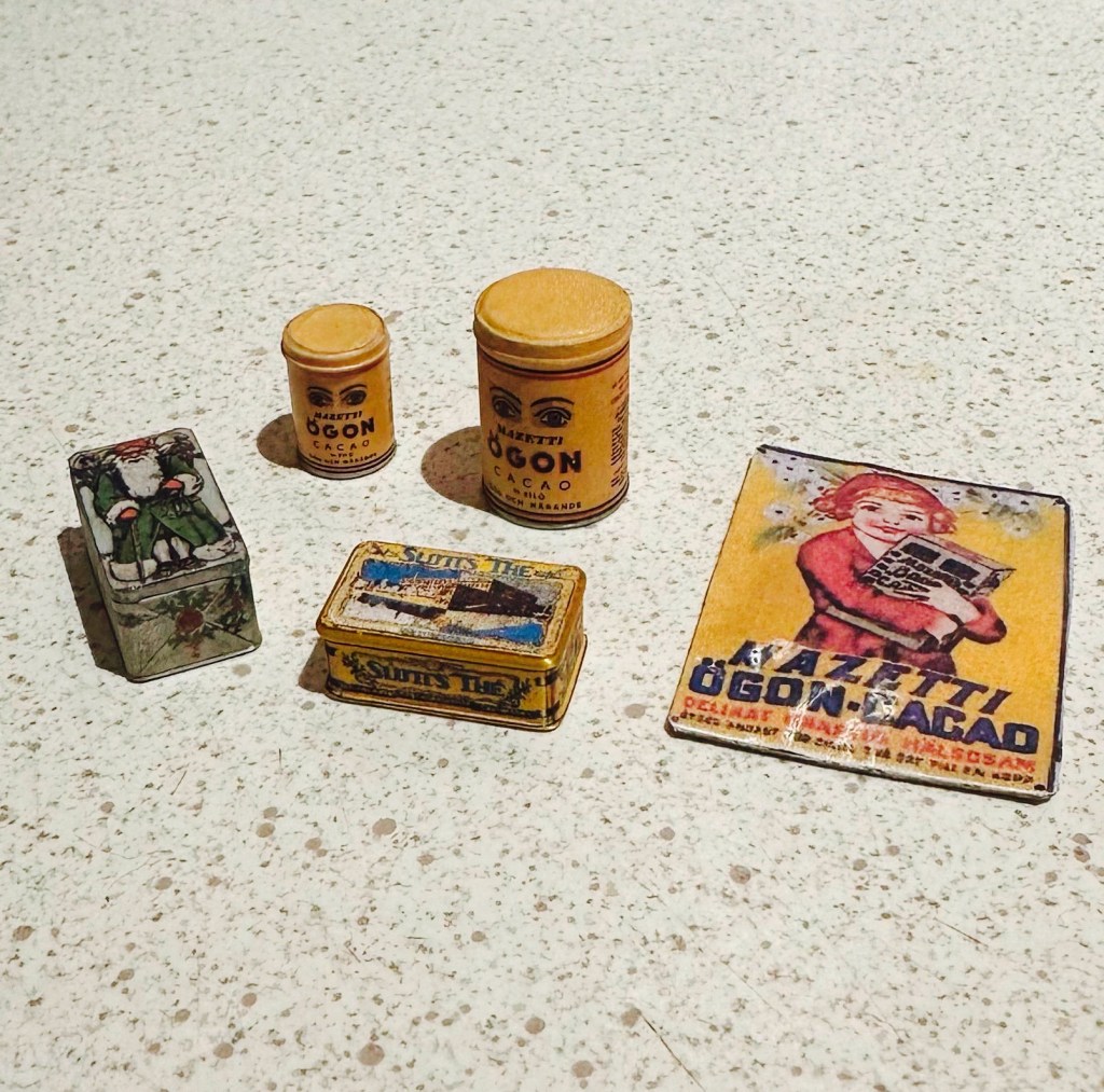 Den andra miniatyristen jag har handlat av gör så fina saker. Jag har köpt olika plåtburkar till dockskåpets kök och en Mazettiskylt av henne.