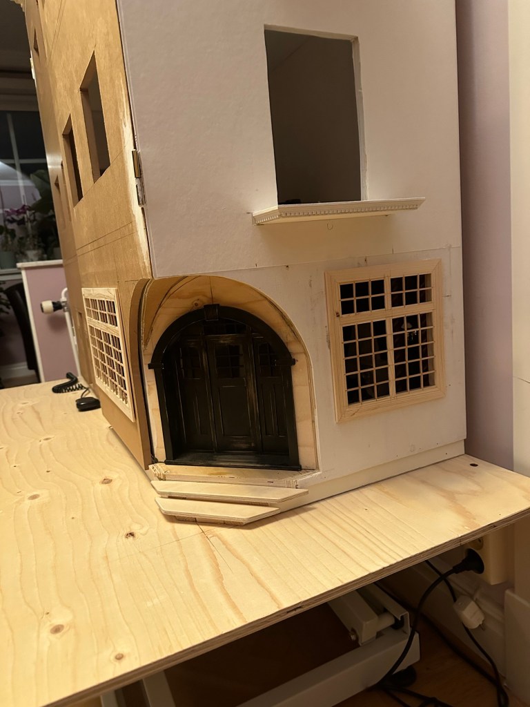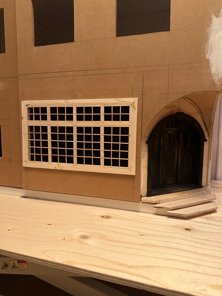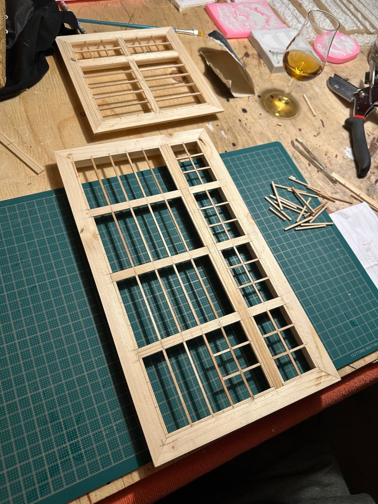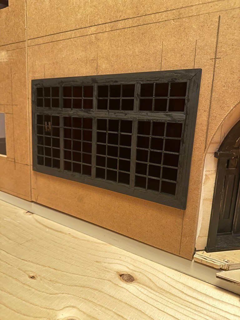 Vilket pillrigt arbete Maths har gjort. Så noggrann och han har ett otroligt tålamod. Först tillverkade han ramen till dessa fönster. Sedan har han mätt upp hur stora fönsterna ska vara och suttit med minimala träpinnar som han limmat fast i fönstret som spröjsar. Han har sedan målat dessa svarta så att det passar ihop med dörren till puben. Fönsterrutorna är inte på plats ännu. Det blir det sista. Han har däremot testat att sätta dit fönsterna, inte med lim såklart. Så här ungefär kommer det att bli.